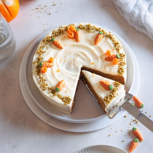 Verteile das Frosting gleichmäßig auf dem ausgekühlten Kuchen. Dekoriere den Möhrenkuchen nach Belieben mit Marzipan-Rübli und gehackten Pistazien oder Walnüssen.Zum Servieren schneidest du den saftigen Karottenkuchen in etwa 12 Stücke. Übrig gebliebene Kuchenstücke kannst du im Kühlschrank aufbewahren.